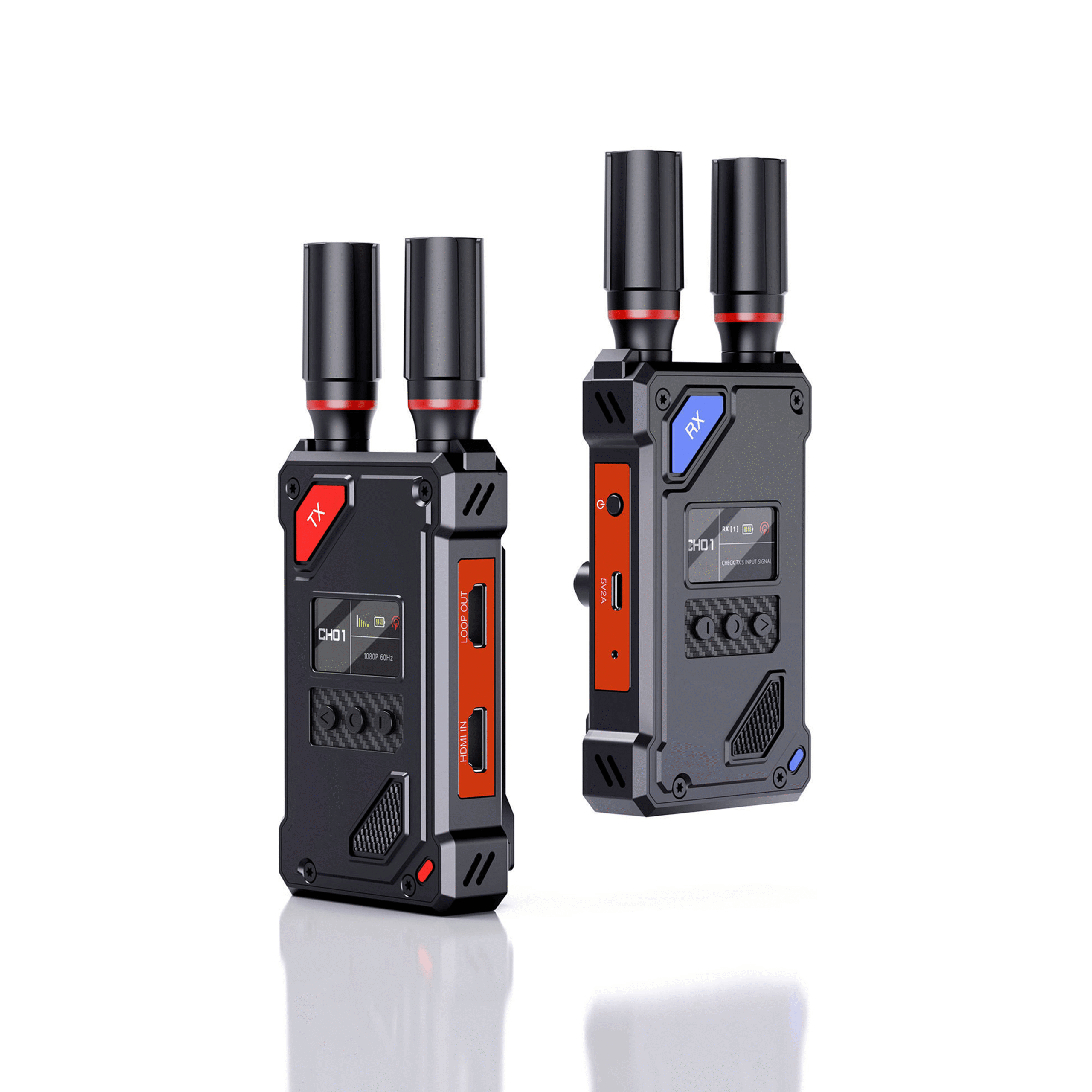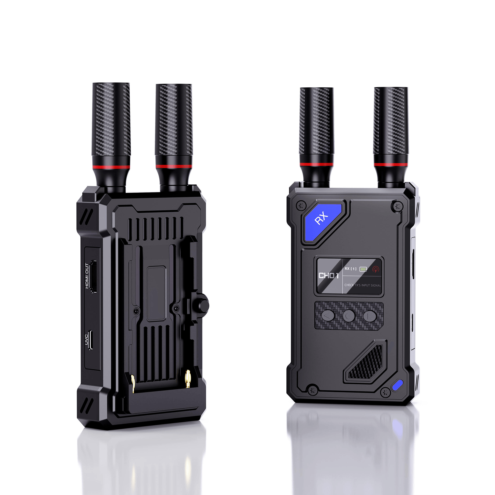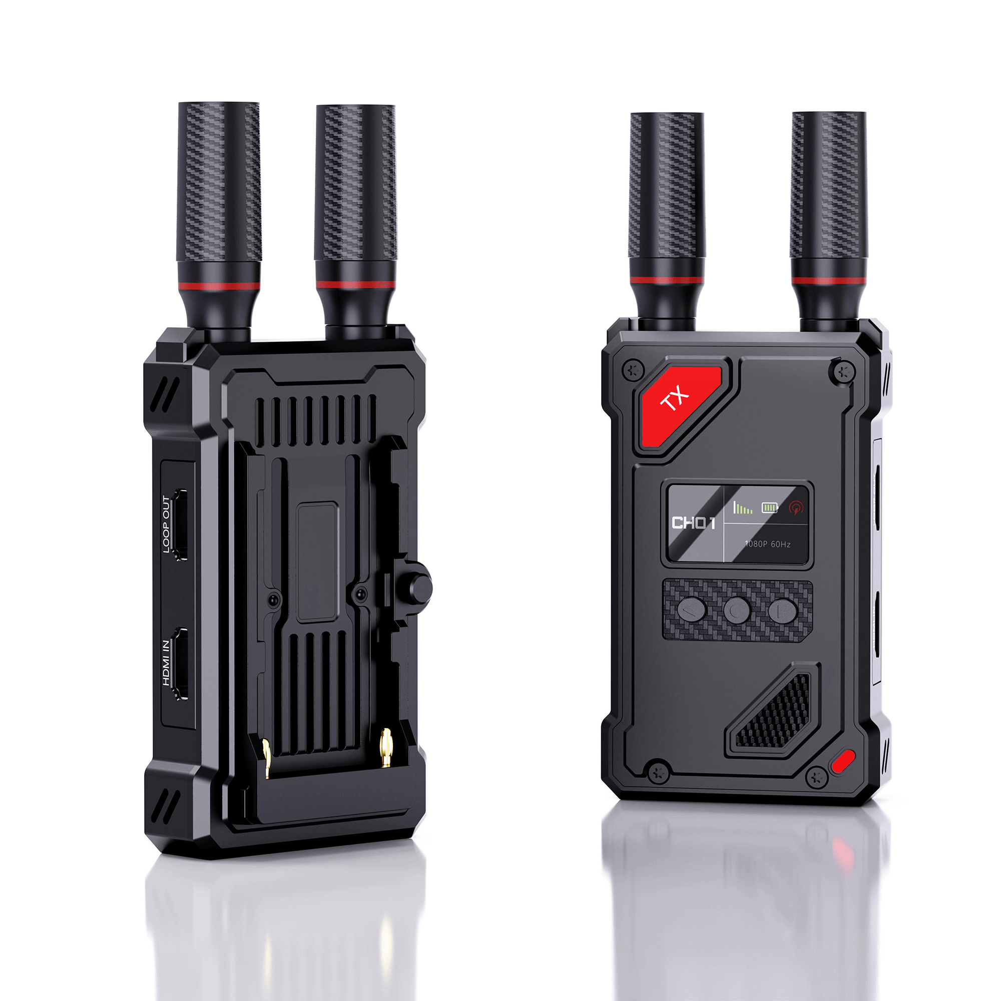 The MA087 Wireless video transmission system with 1500ft range, dual-band 2.4G/5G, HDMI input/output, UVC streaming, and LCD display. Ideal for live streaming and video production