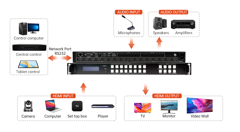 This 8×8 matrix supports 4K@60Hz input, output, switching, splicing, and windowing, delivering seamless performance for control rooms, conference halls, broadcasting centers, and large-scale displays.
