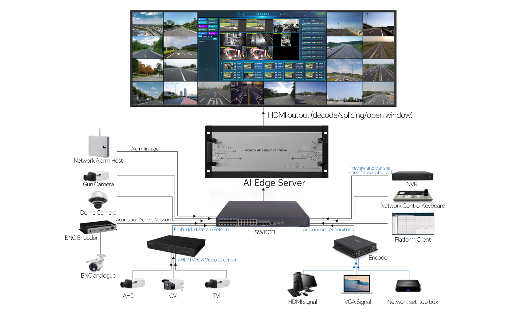 The AI Edge Server is a telecom-grade video surveillance and analysis device. Built on embedded AI technology, it features powerful large-scale video decoding and real-time AI behavior analysis capabilities. It can operate independently offline, bringing intelligent computing to the edge and effectively enhancing the intelligence and response efficiency of monitoring centers.