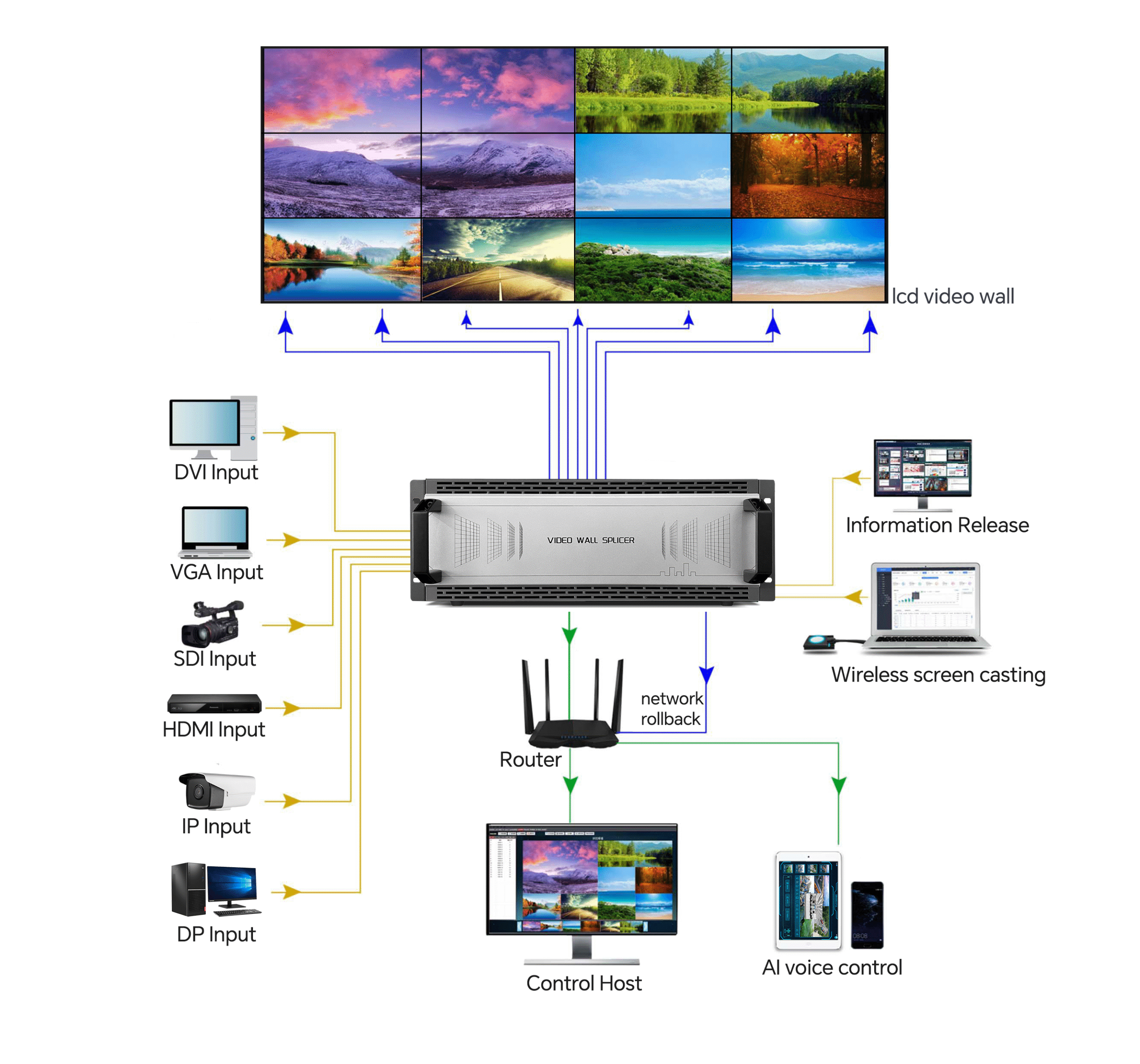 It can take multiple input signals (PC, cameras, media players, etc.), process them through splicing, scaling, and switching, and deliver seamless ultra-HD visuals across multiple screens.Whether in corporate meetings, exhibitions, command centers, or stage events, it ensures a stable and immersive viewing experience.
