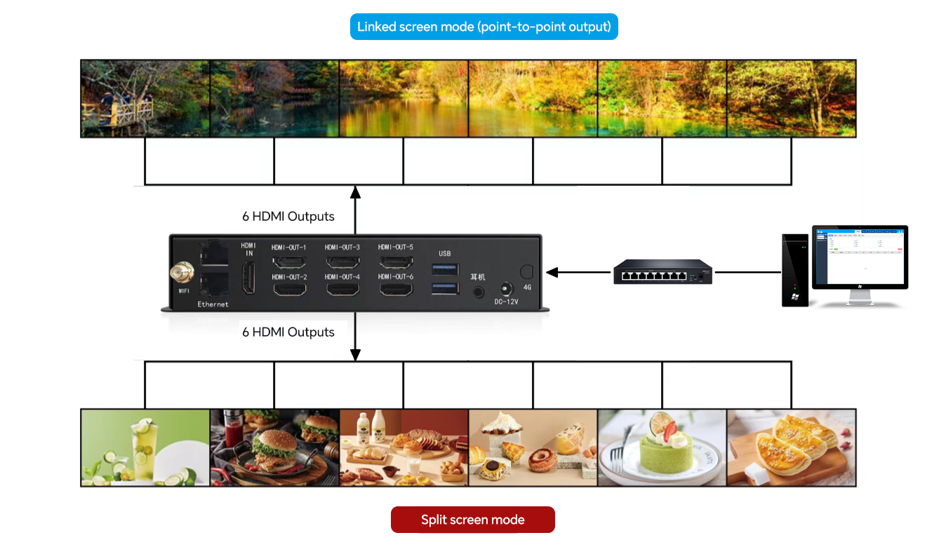 The Network Multimedia Player Box is a high-performance multimedia device that supports multi-screen display, HD decoding, and a wide range of connectivity options. It is ideal for digital signage, information display, monitoring centers, and other scenarios.